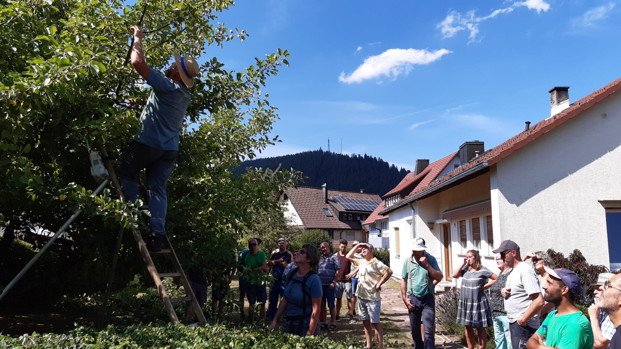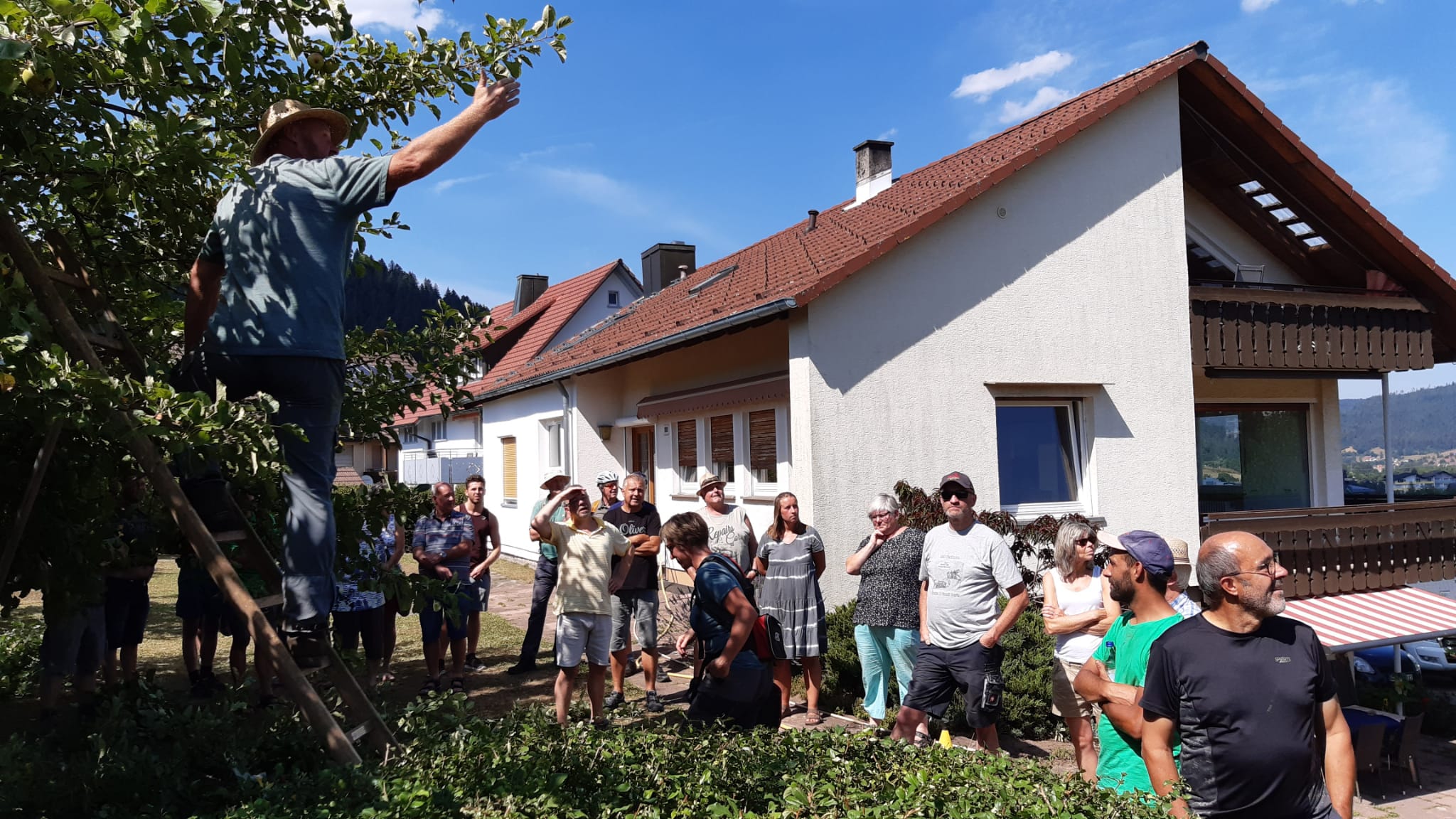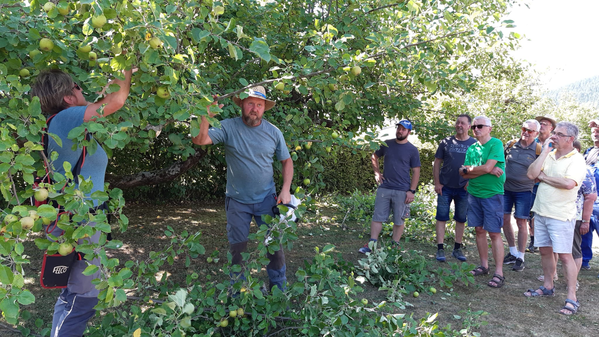 Am 22.07.2022 fand bei unserem Vereinsmitglied Christoph Steudinger zum ersten Mal ein Sommerschnittkurs von Obstbäumen statt. Unsere Fachwarte Jutta und Heiko von Daak zeigten den vielen interessierten Besuchern bei hochsommerlichen Temperaturen eine uns völlig unbekannte und interessante Art des Baumschnittes. Viele der Besucher machten sich anschließend auf den Heimweg, um diese Technik sofort an den eigenen Bäumen umzusetzen.